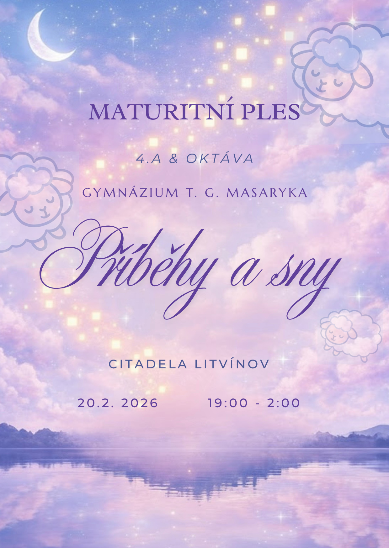 Srdečně Vás zveme na maturitní ples, který se koná 20. 2. 2026 od 19:00 a který letos ponese nádech příběhů a snů – těch, které nás v dětství formovaly, inspirovaly a provázely až k okamžiku, kdy se oktáva a 4.A symbolicky loučí se svými školními roky. V litvínovské Citadele ožijí momenty, které jsme společně psali celé roky. Tak neváhejte a nenechte si tento kouzelný večer ujít!